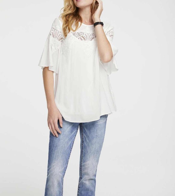 Jednoducho neodolateľné - prepracované detaily dodávajú jednoduchému tvaru módny drive. Ležérne strihaná blúzka značky Heine s tónovou dekoráciou z priehľadnej kvetinovej čipky. Voľná, lichotivej A-postve s mierne rozšírenným lemom. Okrúhly výstrih, zapínanie na rozparok v krku a krátke trubkové rukávy. Ladiaci lichotivý spodný top s tvarujúcimi prsnými záševkami a nastaviteľnými špagetovými remienkami.dĺžka 64 cm, voňavá, živá kvalita zo 100% viskózy, čipka zo 60% polyamidu / 40% polyesteru, vrchná strana zo 100% viskózy