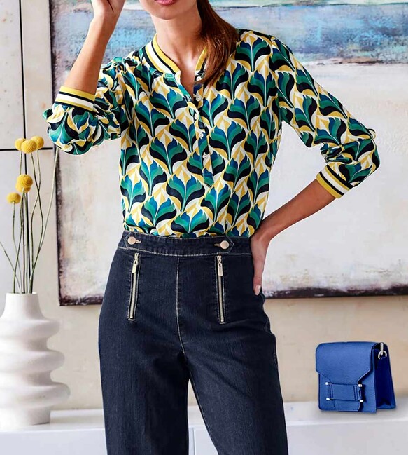 Táto blúzka s potlačou má všetko! Vzrušujúci kvetinový dizajn v brilantnej farebnej kombinácii sa stretáva so športovými pruhovanými pletenými manžetami na okrúhlom výstrihu a manžetách! To musíte mať! S polgombíkovou légou a dlhými rukávmi. Príjemne mäkká tkanina s jemným leskom vyrobená zo 100% viskózy. Voľne sa hrať. Dĺžka 64 cm.