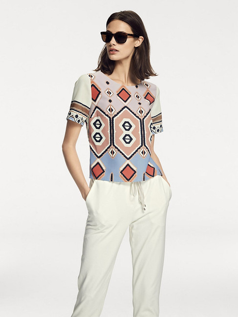 Klasická krása - puristicky elegantná a neodolateľná. Dominuje efektívna všestranná tlač etnických vzorov. Krátka forma priliehavá postve so ženským okrúhlym výstrihom, zips vzadu a krátke rukávy. dĺžka 55 cm, jemná padavá kvalita vyrobená zo 100% polyesteru